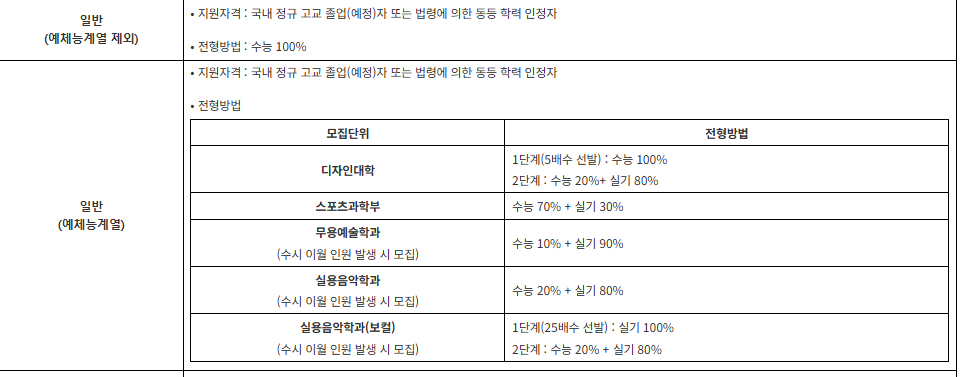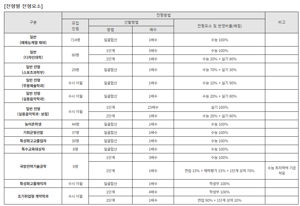 한양대학교 ERICA 2026학년도 정시모집은 수능 중심 선발 비중이 매우 높은 구조로 운영되며, 대부분 모집단위에서 수능 100% 일괄합산 방식을 적용합니다. 예체능 및 일부 특별전형을 제외한 전체 모집의 기본 틀은 수능 성적을 중심으로 한 단순·명확한 선발체계로 구성되어 있습니다. 정시 일반전형 모집정원은 가군 390명, 나군 314명으로 구성되며, 정시 일반전형 총 모집인원은 704명입니다. 이는 수시이월을 제외한 확정된 정원내 기준입니다. 가군에서는 건축학부, 건설환경공학과, 전자공학부, 기계공학과, 로봇공학과, 배터리소재화학공학과 등 공학·첨단 분야 모집 비중이 크며, 디자인계열·스포츠과학부 등 예체능 모집도 포함됩니다. 디자인계열은 1단계 수능 100%로 5배수를 선발한 뒤 2단계에서 **실기 80% + 수능 20%**로 최종 합격자를 가립니다. 스포츠과학부는 수능 70% + 실기 30%, 무용예술학과는 실기 90% + 수능 10% 반영 구조입니다. 국방전략기술공학 특별전형은 1단계 수능 100%(3배수) 이후 면접과 체력검정을 결합하여 선발합니다. 나군은 일반전형 대부분이 수능 100%로 일괄합산되며, 경제학부·경영학부·보험계리학과 등 인문·상경 모집이 중심을 이룹니다. 실용음악학과는 보컬 전공만 1단계 실기 100% 선발 후 **실기 80% + 수능 20%**의 2단계 평가를 적용하며, 기타 전공은 실기 80% + 수능 20% 일괄반영입니다. 특별전형은 모두 수능 100%로 운영됩니다. 수능 반영 방식은 국어·수학은 표준점수, 탐구는 변환표준점수, 영어는 등급별 점수, 한국사는 등급 감점 방식을 적용합니다. 자연계열은 수학(미적·기하) 및 과탐 가산점 비중이 커 공학·과학계열 지원자에게 유리한 체계입니다.