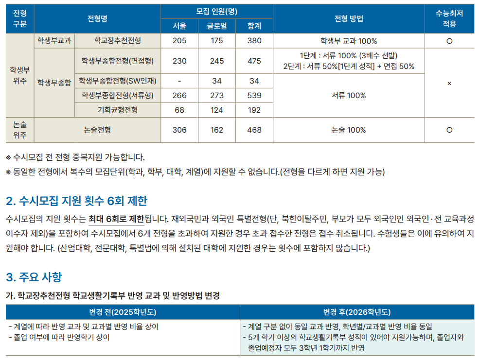 원서접수일은 2025년 9월 9일(화) 10:00 ~ 9월 12일(금) 17:00, 서류제출 2025년 9월 9일(화) ~ 9월 15일(월) 17:00 (PDF 온라인 업로드), 최초합격자 발표 2025년 12월 12일(금)입니다. 교과부전형인 학교장추천전형으로 175명, 학생부종합(면접형) 245, 서류형 273명을 선발합니다. 수능최저기준은 국어, 수학, 영어, 탐구(사회 혹은 과학탐구 1과목) 중 1개 영역 등급이 3 이내이고, 한국사 영역 4등급 이내입니다. 주요 변경사항으로 학교폭력 조치사항 반영 강화되어 전형별 평가 시 학교폭력 조치 이력이 기재된 경우 최대 총점의 100%까지 감점 가능하므로 지원 전 반드시 전형별 반영 방법 확인 필요합니다. 서류 제출 방식 온라인화로 모든 제출 서류는 원서접수 사이트에서 PDF 업로드로 진행합니다. 최종 합격자는 추후 원본 서류 제출 필수입니다. 원서접수 간소화로 증명사진 업로드 시 교복 착용 사진도 허용됩니다.