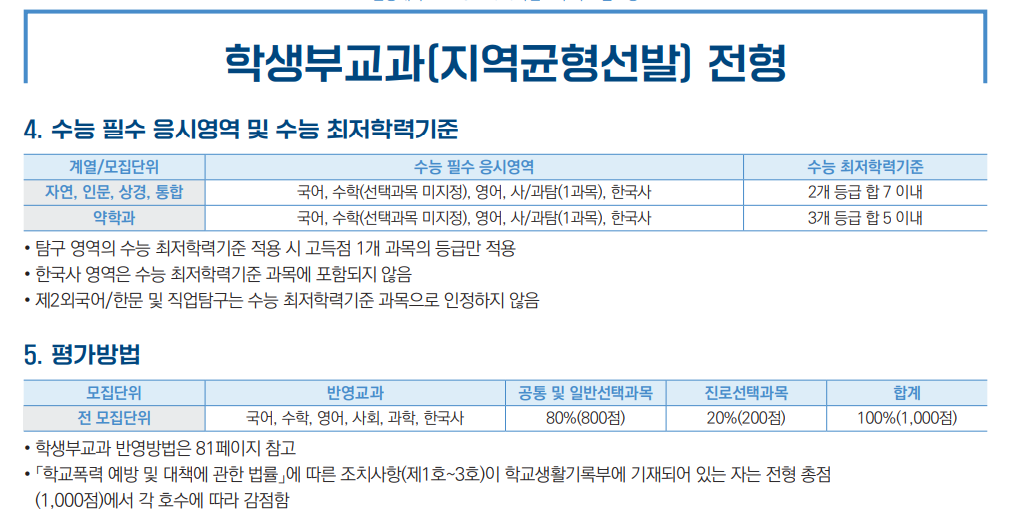 전형 일정은 원서접수 2025. 9. 9.(화) 10:00 ~ 9. 12.(금) 18:00, 서류제출 2025. 9. 9.(화) ~ 9. 15.(월), 최초합격자 발표 일부 전형 2025. 11. 7.(금), 교과·종합·재능우수자(디자인) 2025. 12. 12.(금)입니다. 학생부 교과 전형 모집인원은 지역균형선발 전형으로 540명 모집입니다. 주요 변경 사항으로 학교폭력 반영 강화하여 교과전형 지원자격 제한·감점, 실기/실적(무용·실용음악) 감점 반영, 전형 운영 변화로 국방전략기술공학 1단계 선발 3배수 (기존 4배수), 조기취업형 계약학과 1단계 4배수 (기존 5배수), 종합(서류형·면접형) 중복지원 허용입니다. 수능 최저학력기준은 학생부교과(지역균형선발)이며 국어, 수학, 영어, 탐구 영역 중 2개 영역 등급 합 7 이내 (탐구는 1과목 반영), 한국사 필수 응시 (등급 미반영, 결시 시 불합격 처리)입니다.