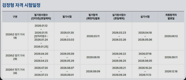 - 2026년 일정: 1월, 4월, 7월에 필기 접수가 시작되며 총 3회의 응시 기회가 있습니다.