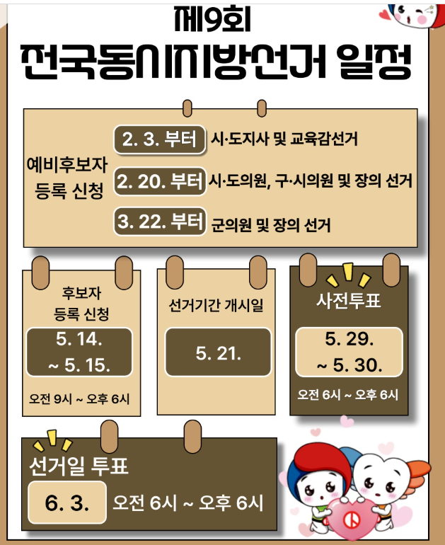 | 2026년 제9회 지방선거 일정, 사전투표기간,투표방법 알아보기 (0) | 2026.02.14 |