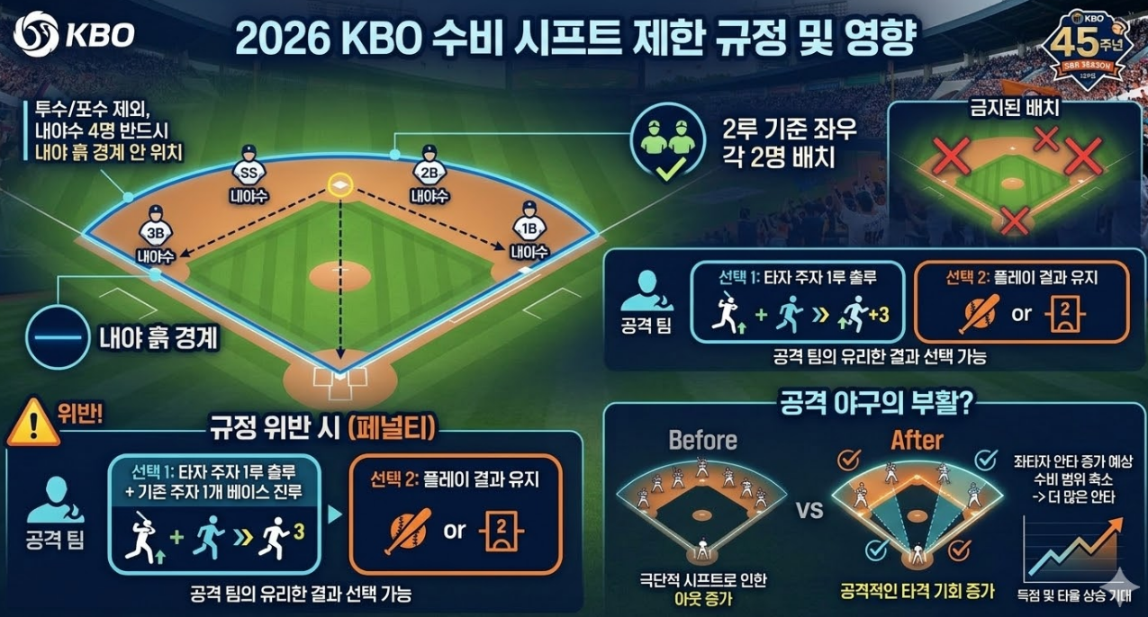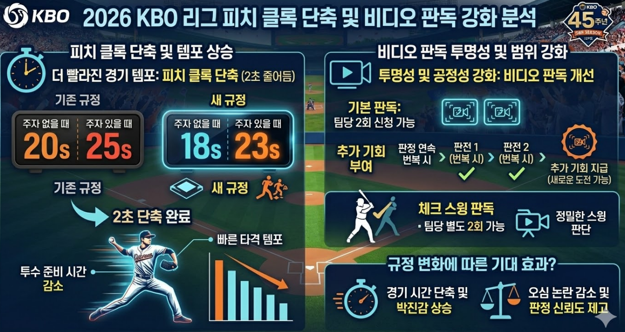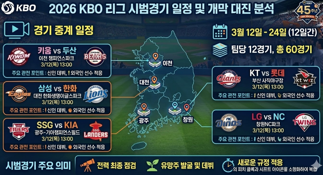 2026 KBO 리그 시범경기가 3월 12일 막을 올립니다. 수비 시프트 제한과 더욱 빨라진 피치 클록 등 45번째 시즌을 맞아 대대적으로 변화하는 규정과 팀별 관전 포인트를 분석합니다.