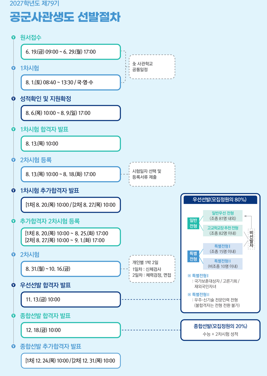 2027학년도 79기 신입생 선발을 위한 전형 일정은 예년보다 다소 늦춰진 형태로 진행됩니다. 원서 접수는 2026년 6월 19일부터 6월 29일까지이며, 가장 중요한 1차 시험은 8월 1일에 전국 고사장에서 실시될 예정입니다. 1차 합격자 발표 이후 진행되는 2차 시험(신체검사, 체력검정, 면접)은 8월 31일부터 10월 16일까지 사관학교 내에서 개인별 일정에 따라 진행됩니다. 최종 합격자는 우선선발의 경우 11월 13일에, 종합선발은 11월 18일에 각각 발표되는 것으로 보입니다.