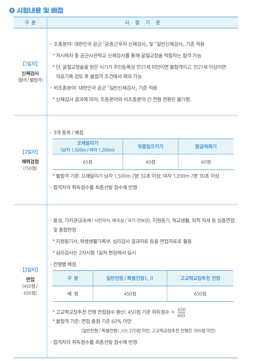 합격자들의 학생부 교과 성적(내신)을 살펴보면, 공사 입학의 문턱이 결코 만만치 않음을 알 수 있습니다. 우선선발 합격자들의 평균 교과 등급은 2.1등급에서 2.6등급 사이를 형성하고 있으며, 학교장 추천 전형의 경우 1.5등급 내외의 최상위권 학생들이 다수 포함된 것으로 보입니다. 내신 100점 만점 중 교과 점수가 90점을 차지하고 석차 등급이 산출되는 과목만 반영되기에, 일반고 수험생들은 주요 과목에서 최소 2등급 초반대를 유지하는 것이 안정적인 합격권이라 봅니다. 하지만 내신 등급이 조금 부족하더라도 2차 시험에서 충분히 만회가 가능해 보입니다. 공사는 면접 비중이 50%로 매우 높으며, 체력검정 또한 10%의 비중을 차지하지만 실질적인 당락에 미치는 영향력이 상당합니다. 특히 조종 분야 신체검사에서 안과 기준 미달로 탈락하는 사례가 매년 발생하므로, 성적 관리와 더불어 신체 조건을 사전에 점검하는 것이 현명해 보입니다. AI 면접과 심층 면접에서는 공군이 지향하는 핵심 가치인 도전과 헌신을 자신의 경험과 연결하는 서사가 필요해 보이며, 이러한 진정성이 성적의 열세를 뒤집는 열쇠가 되었을 것으로 보입니다.