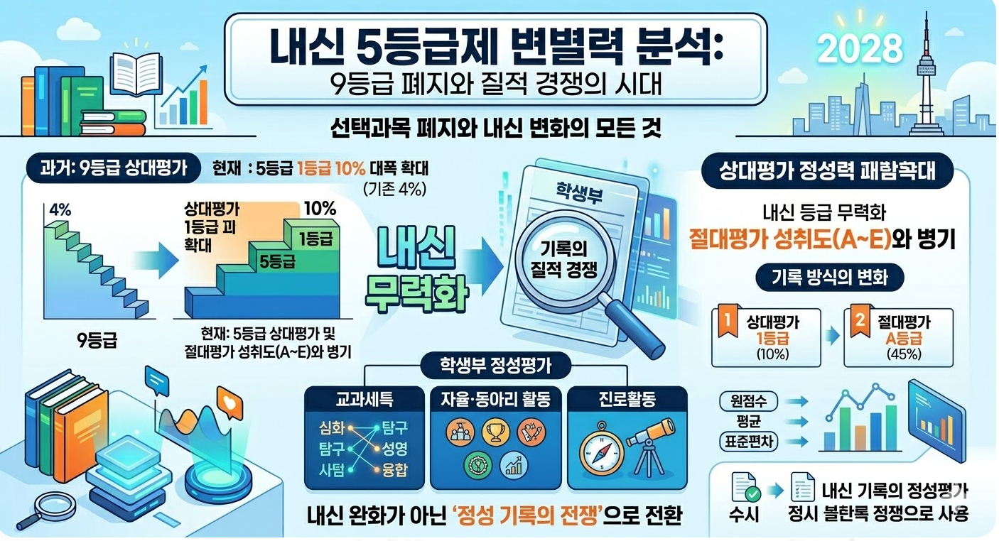 2028학년도 대입 개편안의 핵심인 통합형 수능과 내신 5등급제 변화 내용을 심층 분석하고, 대학별 정성평가 확대에 따른 수험생의 구체적인 입시 대응 전략을 제시합니다.