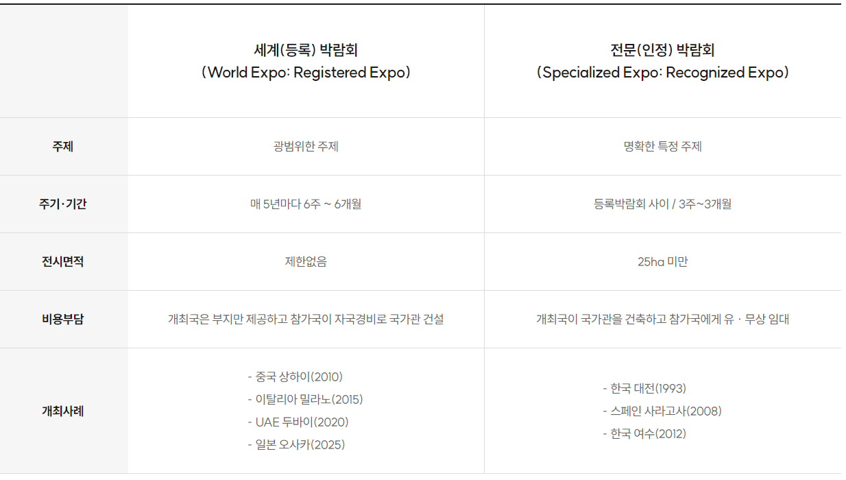 세계(등록) 박람회(World Expo: Registered Expo)는 광범위한 주제로 매 5년마다 6주 ~ 6개월간 열립니다. 개최국은 부지만 제공하고 참가국이 자국경비로 국가관을 건설하는 것이 특징입니다. 전문(인정) 박람회 (Specialized Expo: Recognized Expo)는 명확한 특정 주제로 등록박람회 사이 3주~3개월에 결쳐 열립니다. 개최국이 국가관을 건축하고 참가국에게 유, 무상 임대하는 것이 차이가 있습니다. 한국에서 두번 열렸던 엑스포는 전부 전문 엑스포였습니다. 한국에서는 1993년 대전 엑스포, 2012년 여수세계박람회가 열렸습니다.