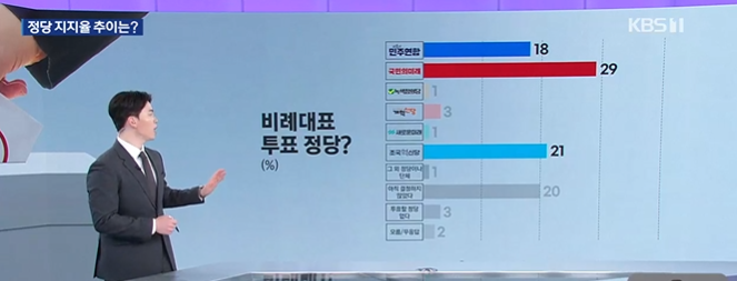 KBS가 한국리서치에 의뢰해 지난 17일부터 19일까지 사흘간 전화 면접 조사로 전국 유권자 3,000명의 응답을 통하여 얻은 조사(표본 오차 95% 신뢰 수준에 ±1.8%포인트) 결과를 보면 국민의 미래는 비례정당 지지율에서 29%를 받아 더불어민주연합이 18%, 조국혁신당 21%보다 높아 가장 앞서고 있습니다. 물론 범진보인 더불어민주연합, 조국혁신당을 합한 지지율 39%보다는 낮습니다. 국민의 미래는 35명의 후보와 순번을 발표하였으며 당선 가능성은 20번 정도로 보고 있습니다.