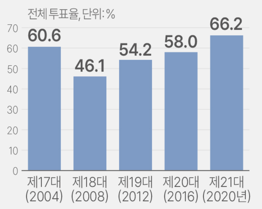 22대 총선 출구조사 결과는 투표 종료 시간인 18시에 KBS, MBC, SBS 지상파 3사를 통하여 발표되었습니다. 최종 투표율은 67.0%를 기록하며 지난 21대 총선 66.2%를 넘어서면서 1992년 14대 총선 투표율인 71.9%이후 역대 최고를 기록했습니다. 마의 70%대 벽을 끝내 넘지는 못했지만 상당한 투표율이 나오면서 큰 관심을 모았음을 확인할 수 있었던 선거로 기록될 것입니다.