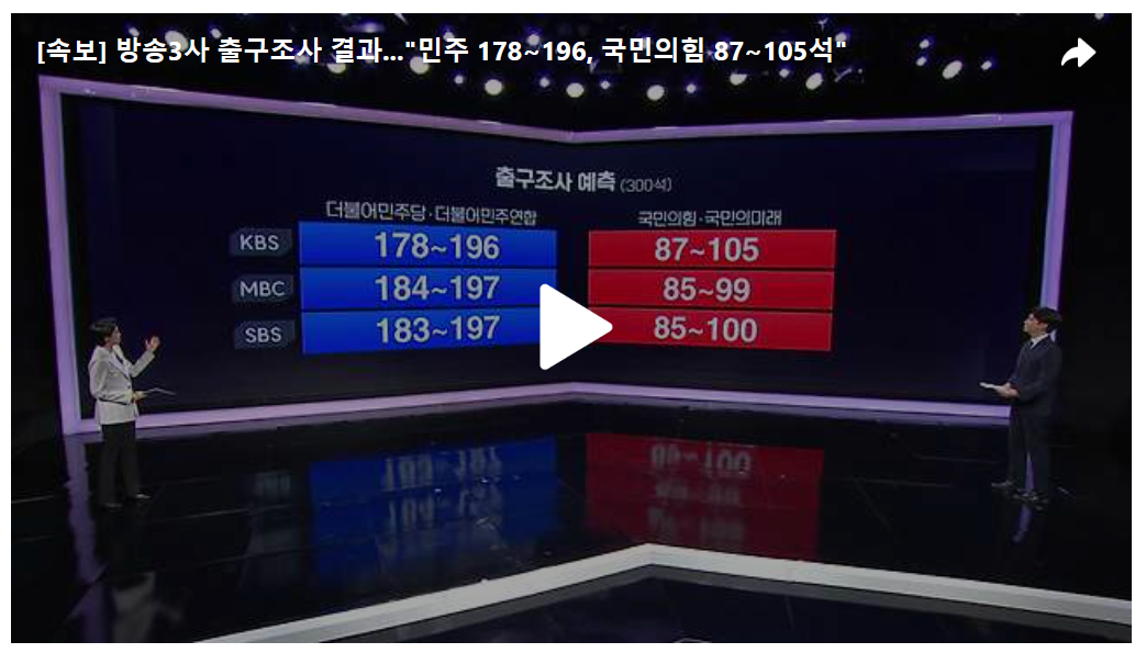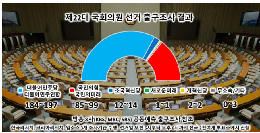 출구조사 결과는 야당인 민주당의 압승으로 끝날 것으로 전망됩니다. 방송사가 공동으로 조사한 출구 조사는 각 사별로 예상치는 다소 차이가 있지만 모든 방송에서 민주당의 압승을 예상하고 있습니다. 각 방송사별로 보면 MBC는 민주당, 더불어민주연합 184~197석, KBS 178~196, SBS 183~197석으로 결과를 발표했습니다. 여당 국민의 힘, 국민의 미래는 MBC 85~99, KBS 87~105, SBS 85~100석으로 전망하며 110석도 안될 것으로 내다봤습니다. 이번 출구 조사에는 금일 선거일 실시한 조사 결과 외 사전투표에 대한 전화 면접 결과도 일부 반영되어 있는 것으로 전해졌습니다.