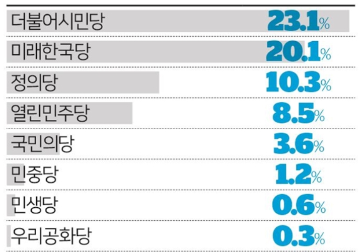 또 다른 조사인 한국일보가 한국리서치에 의뢰하여 역시 7~8일 유권자 1,000명을 대상으로 조사한 결과에서는 더불어 시민당 23.1%, 미래 한국당 20.1%, 정의당 10.3%, 열린 민주당 8.5%, 국민의 당 3.6%, 민중당 1.2%로 나타났습니다.