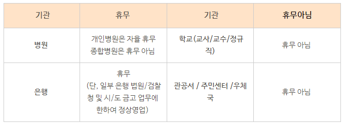 반면에 시청, 주민센터, 우체국 같은 관공서는 근로기준법을 적용받지 않는 공무원들로 정상으로 엽니다. 법원, 학교와 국공립 유치원도 마찬가지로 정상 운영합니다. 병원의 경우 병원장 재량에 따라 자율 휴무 형식으로 쉴 수 있습니다. 관공서의 경우 정상으로 업무를 보고 있어 이 곳에 위치한 은행은 정상으로 영업을 하고 휴일 수당을 받게됩니다.