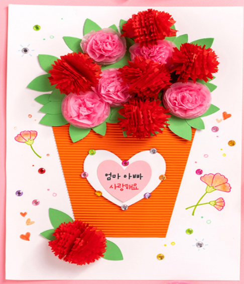 오래전 미국에서 한 여성이 고인이 된 어머니를 추도하는 뜻으로 흰 카네이션꽃을 다른 이들에게 전달해준 데서 비롯되어 어머니에 대한 존경과 사랑을 상징하는 꽃으로 자리잡았다고 하는데 이제는 어버이날을 상징하는 꽃이 되었습니다. 어버이날 직접 만든 꽃을 달아 드리거나 나의 어린 자녀들이 내게 달아주는 광경은 어버이날에만 볼 수 있는 장면이기도 합니다. 많이 사용되는 꽃의 색깔은 빨간색으로 꽃말은 ‘어버이에 대한 사랑’, ‘건강을 기원하는 사랑’으로 알려져 있습니다. 흰색 카네이션은 주로 고인이 된 분을 추모하는 의미로 쓰이니 아직 생존해 계신 분들에게는 어버이날에는 어울리지 않습니다. 노란색은 경멸, 거절, 실망의 뜻을 담고 있으므로 절대 드려서는 안되겠습니다.