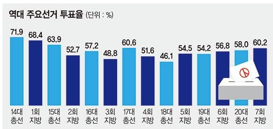18시 기준 6.1 지방선거의 투표율은 50.0%로 저조한 투표율을 기록하고 있습니다. 사전 투표율은 20.6%로 최대를 기록했기에 가장 높은 투표율을 기록할 것으로 예상했지만 지난 선거 60.2%보다도 낮아질 것으로 보입니다. 무려 10% 정도 떨어진 것으로 정치 무관심과도 무관하지 않습니다.