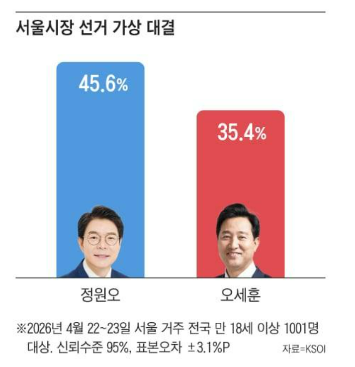 정원오 후보와 오세훈 후보의 지지율 격차 확인