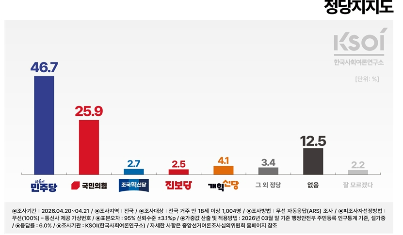 조사기관, 조사일, 조사방식, 응답율보다 자세한 내용은 중앙선거여론조사심의위원회 홈페이지를 참조하면 된다. 조사기관: CBS·한국사회여론연구소(KSOI), 조사일: 2026년 4월 22일~23일, 조사방식: 무선 전화 ARS, 응답율: 5.1%