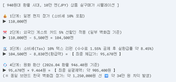 엔화가 940원대로 올라섰다고 해서 일본 쇼핑의 경쟁력이 사라진 것은 아닙니다. 여전히 일본의 물가 상승률은 한국에 비해 상대적으로 완만한 편이며, 2026년부터 더욱 체계화된 소비세 10% 면세 제도를 적절히 활용하면 여전히 국내 정가 대비 20% 이상의 가격 이점을 누릴 수 있습니다. 특히 백화점에서 외국인 관광객에게 제공하는 5% 게스트 카드 할인과 면세 혜택을 결합할 경우, 실질 구매가는 환율 상승분을 충분히 상쇄하고도 남는 수준임을 확인했습니다.