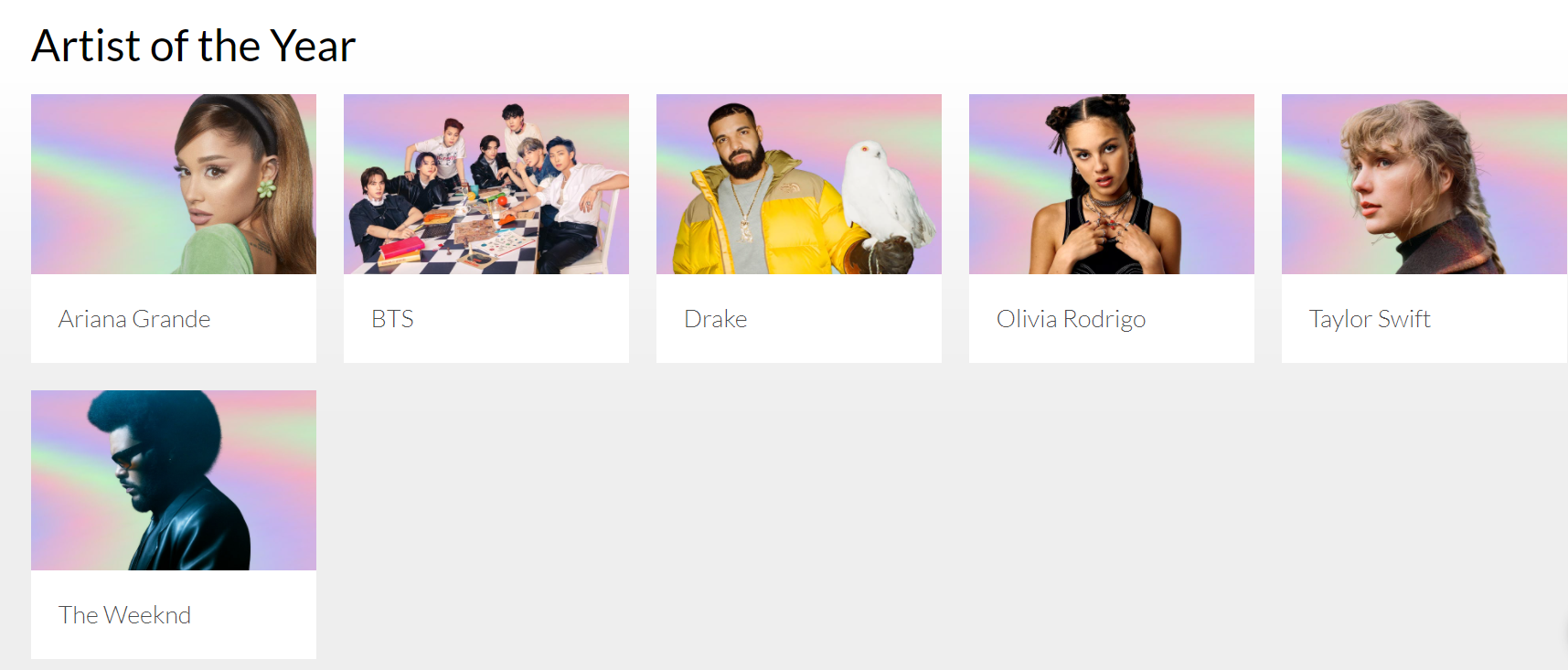 올해의 아티스트에 함께 경쟁하게 될 후보는 아리아나 그란데(Ariana Grande), 테일러 스위프트(Taylor Swift), 더 위켄드(The Weeknd), 드레이크(Drake), 올리비아 로드리고(Olivia Rodrigo) 입니다. 모두 쟁쟁한 팝스타들로 치열한 경쟁이 예상됩니다. 불과 1년 전만 해도 거의 알려지지 않은 올리비아 로드리고는 2021년 아메리칸 뮤직 어워드의 강력한 주요 경쟁자입니다. 올해의 아티스트 부문에서 Taylor Swift 는 8번째로 후보에 지명되었습니다. Drake는 다섯 번째, Ariana Grande 와 The Weeknd는 각각 4번째이며 방탄소년단 과 로드리고는 첫번째 후보 지명입니다. BTS는 아시아 가수로는 최초로 AMA 올해의 아티스트 부문에 지명되었습니다. 수상하게 되면 아시아 가수로서는 최초라는 영예를 얻을 수 있게 됩니다.