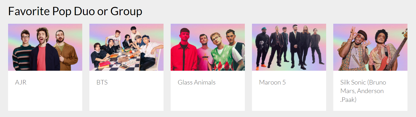 BTS가 이번에 후보로 지명된 분야는 올해의 아티스트(Artist of the Year), 인기 팝 듀오, 그룹(Favorite Pop duo or Group), 인기 팝송(Favorite Pop Song)입니다. 인기 팝송은 큰 인기를 끌었던 ‘Butter’입니다.