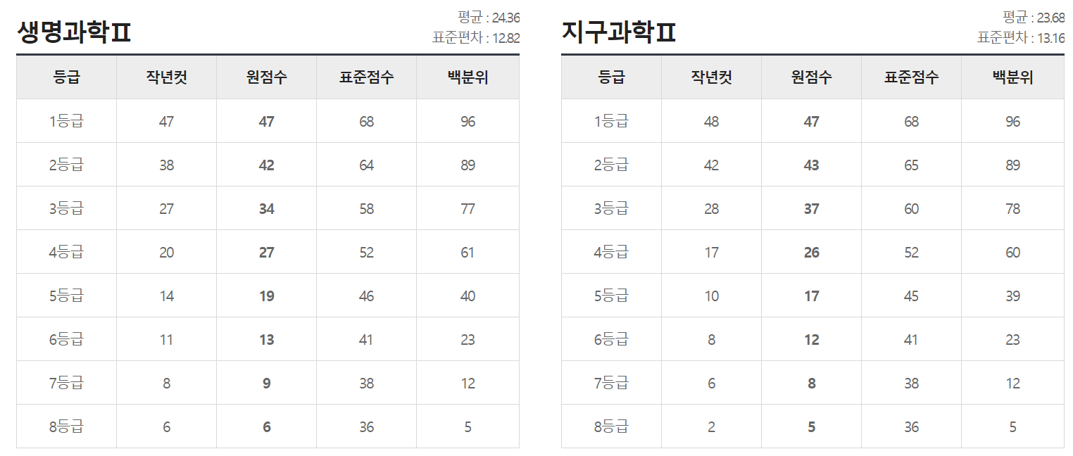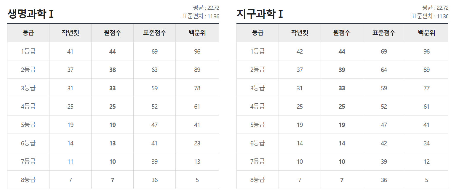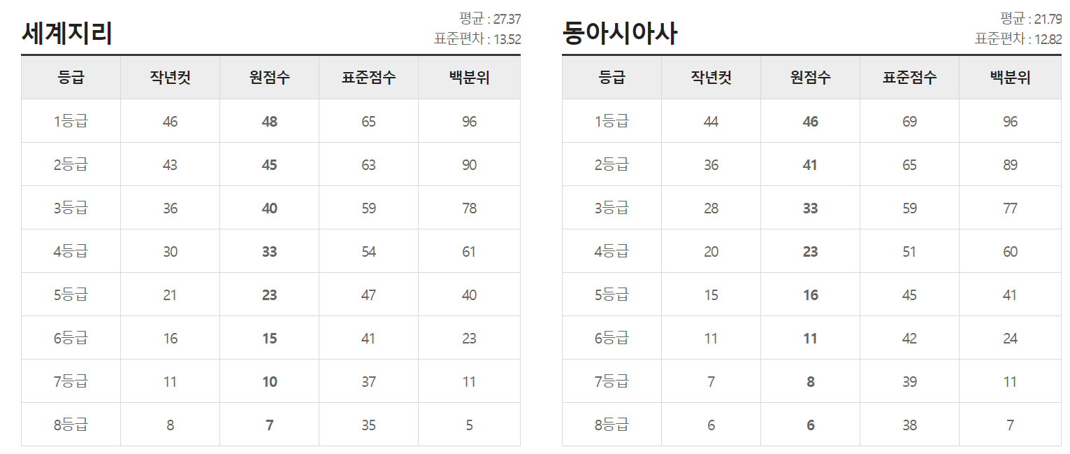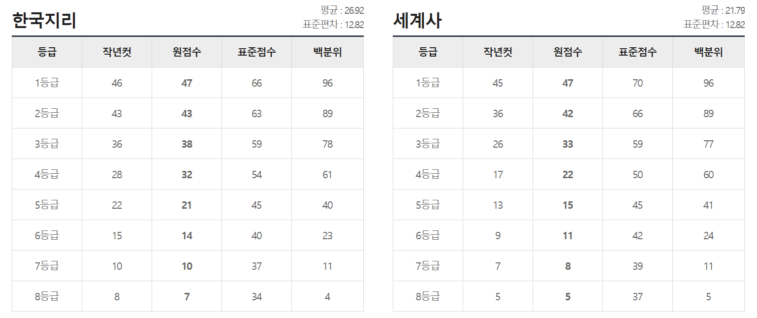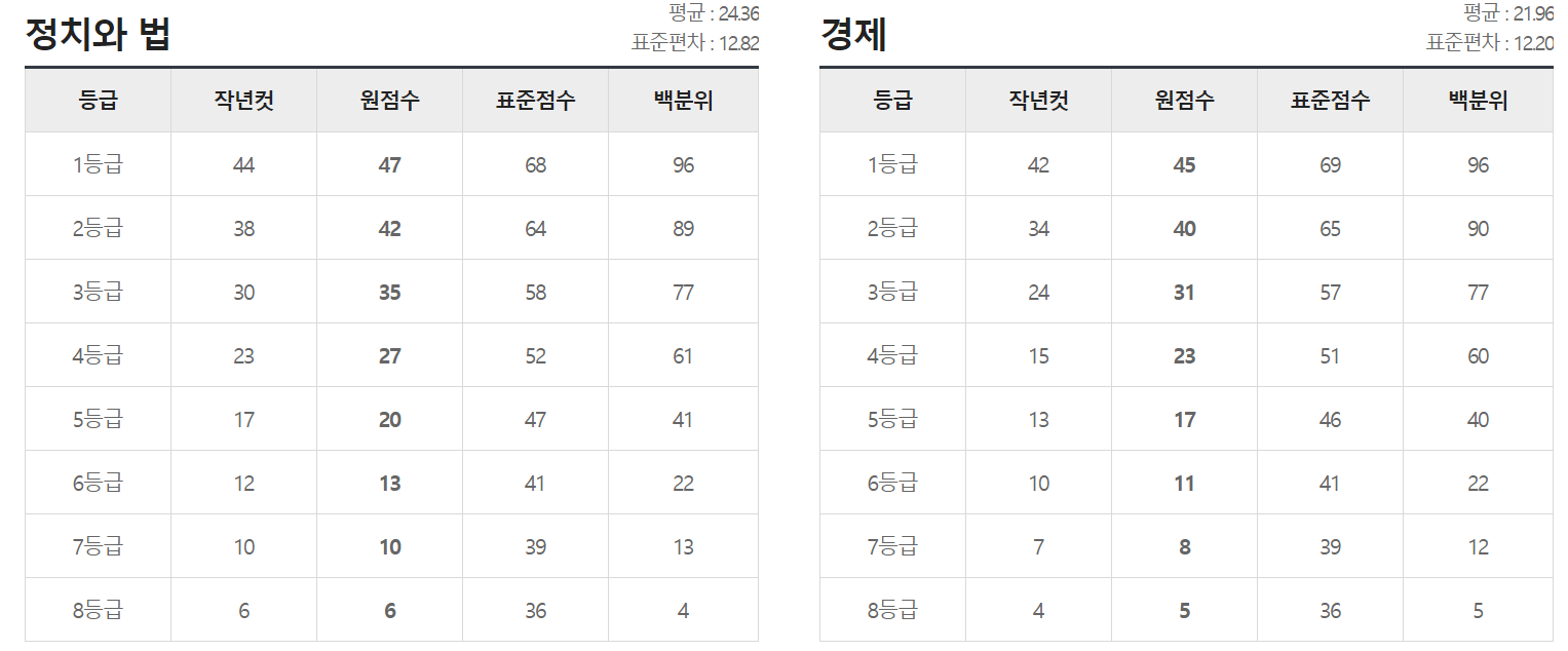 사회, 과학 탐구 예상 등급컷은 아래 표를 참고하시기 바랍니다.