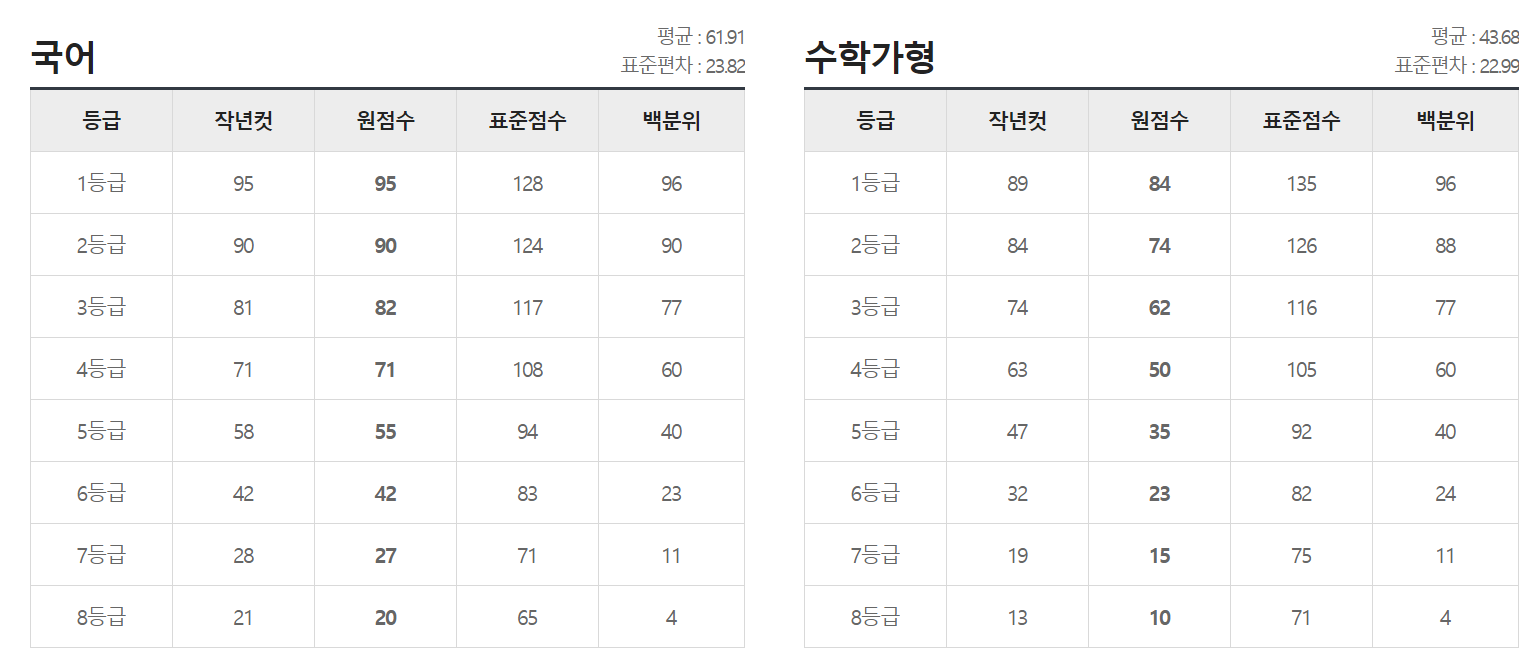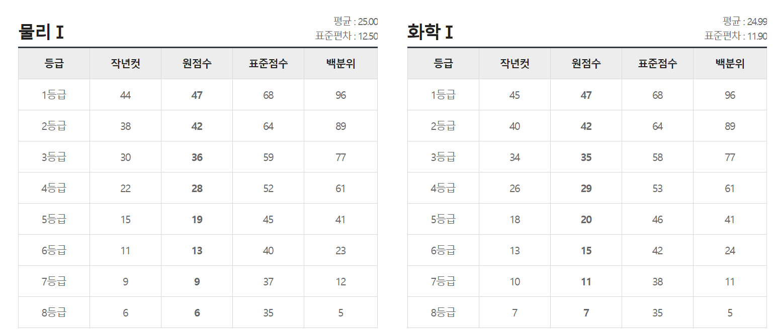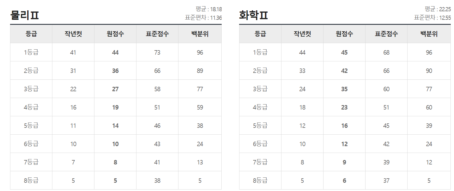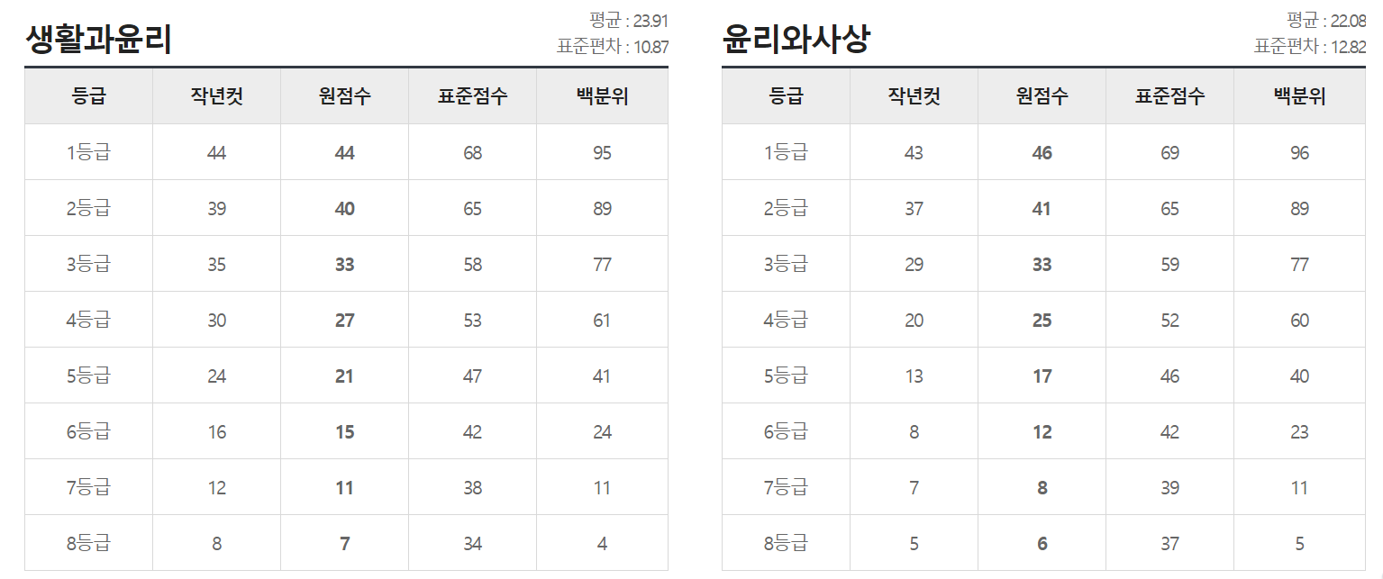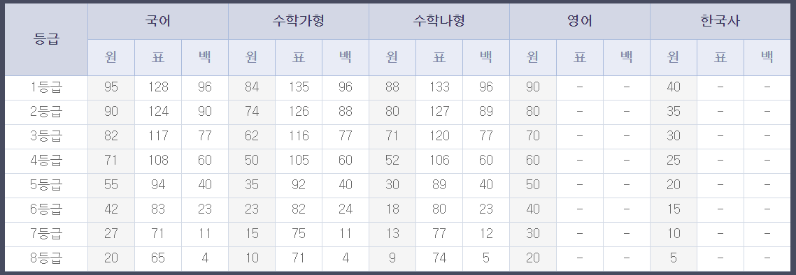 사회, 과학 탐구 예상 등급컷은 아래 표를 참고하시기 바랍니다.