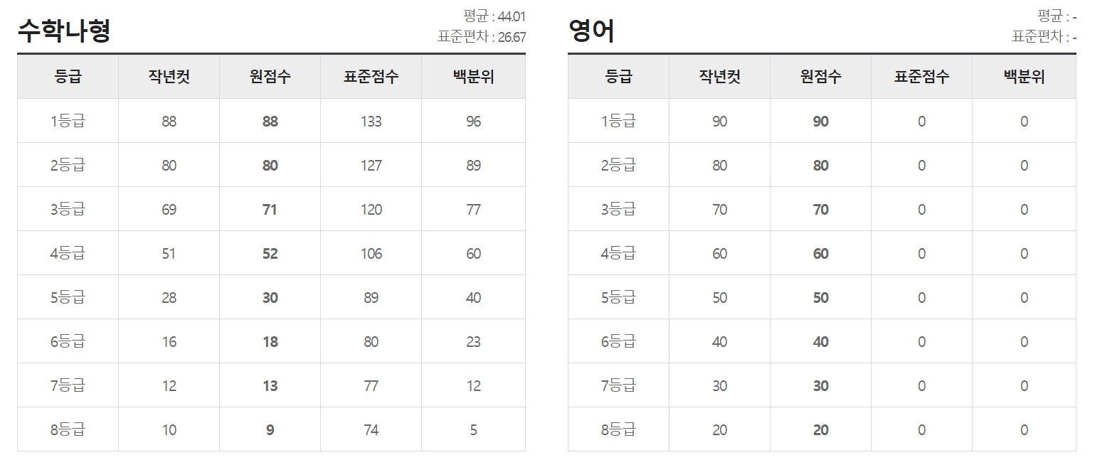 수학 나형은 1등급 88점, 2등급 80점, 3등급은 71점으로 분석되었습니다. 절대평가인 영어 1등급은 90점, 2등급 80점, 3등급 70점, 한국사는 1등급 40점, 2등급 35점, 3등급 30점입니다. 평균 점수로 보면 국어는 61.91, 수학가형은 43,68, 수학나형은 44.01점으로 예상됩니다.