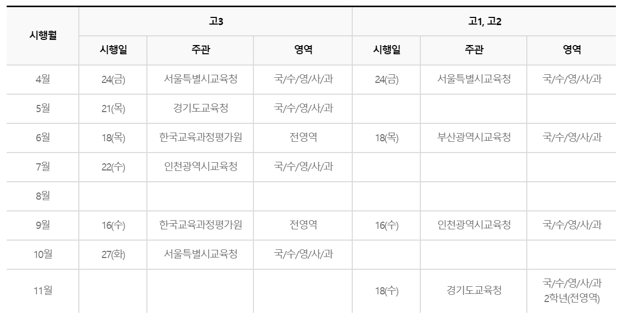 7월 22일에는 인천시 교육청 주관으로 고3학생 대상으로 모의고사가 치러질 예정입니다. 9월 16일도 한국교육평가원 주관으로 모의 평가 시험이 있을 예정인데 수능 시험 전 마지막으로 치러지는 시험입니다. 고3생은 10월 27일 서울시 교육청 주관으로 모의 평가를 한번 더 보게 되며 수학능력 시험일은 12월 3일에 있을 예정입니다. 고등학교 1,2학년은 9월 16일과 11월 18일에 각각 모의 고사를 치르게 됩니다.