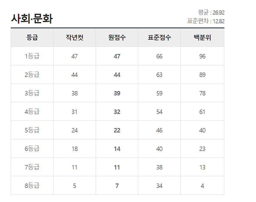 사회, 과학 탐구 예상 등급컷은 아래 표를 참고하시기 바랍니다.