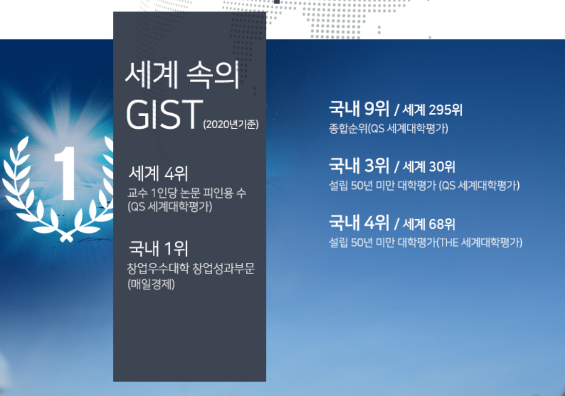 지스트는 1993년에 설립된 이공계 특성화 대학입니다. 입학하는 학생들은 전원 기숙사를 지원받아 학업을 이어갈 수 있으며 모든 수업은 영어로 진행되며 다른 특성화 대학과 마찬가지로 입시에서 수학과 과학 과목의 비중이 매우 높으며 많은 대비가 필요합니다. 설립후 꽤 오랜 동안 대학원 중심으로 운영하여 학부 신입생을 뽑지 않았으며 2010년에 들어서부터 학부생을 받기 시작했습니다. 한국에서는 카이스트 뒤를 이어 두번째로 설립된 과기원입니다.