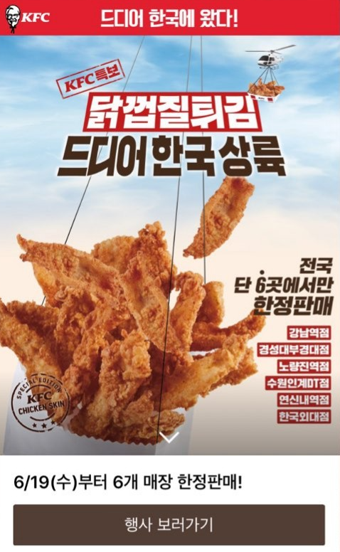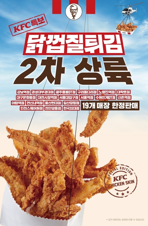 처음에는 전국 6개 매장에서만 판매를 하였는데 폭발적인 반응으로 6월 27일부터 전국 13개 매장으로 확대를 하여 총 19개 매장에서 ‘KFC 닭껍질 튀김’을 만나볼 수 있게 되었습니다. 현재 본 제품을 구입할 수 있는 매장은 강남역점, 경성대부경대점, 광주용봉DT점, 구리돌다리점, 노량진역점, 대학로점, 대구문화동점, 대전시청역점, 서울대입구점, 서울역점, 수원인계DT점, 신촌역점, 야탑역점, 연신내역점, 울산현대점, 일산장항점, 인천스퀘어원점, 천안쌍용점, 한국외대점 등입니다.