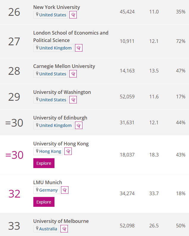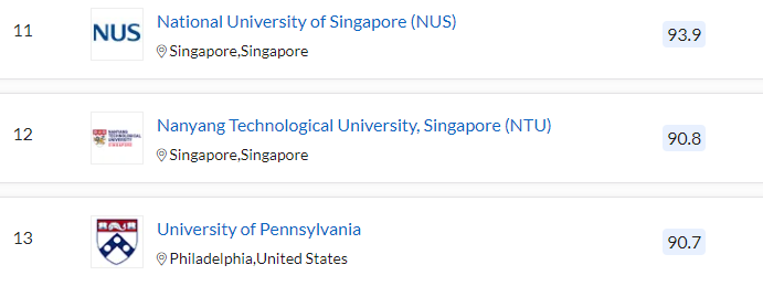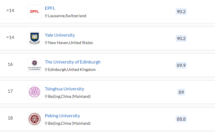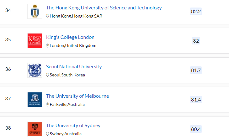 QS 세계 대학 순위에서는 미국의 MIT가 세계 1위입니다. 2위는 옥스퍼드, 3위 케임브리지대, 스탠퍼드대, 5위 하버드, 6위 캘리포니아 공과대, 7위 임페리얼 칼리지 런던, 8위 유니버시티 칼리지 런던, 취리히 연방 공과 대학, 10위, 시카고 대학입니다. QS 평가 아시아 대학 순위는 11위 싱가포르 국립대, 12위 싱가포르 난양공과대, 17위 중국 칭화대, 18위 중국 베이징대, 22위 홍콩대, 23위 도쿄대, 31이 중국 푸단대, 33위 교토대, 34위 홍콩과기대, 36위 서울대 순입니다.