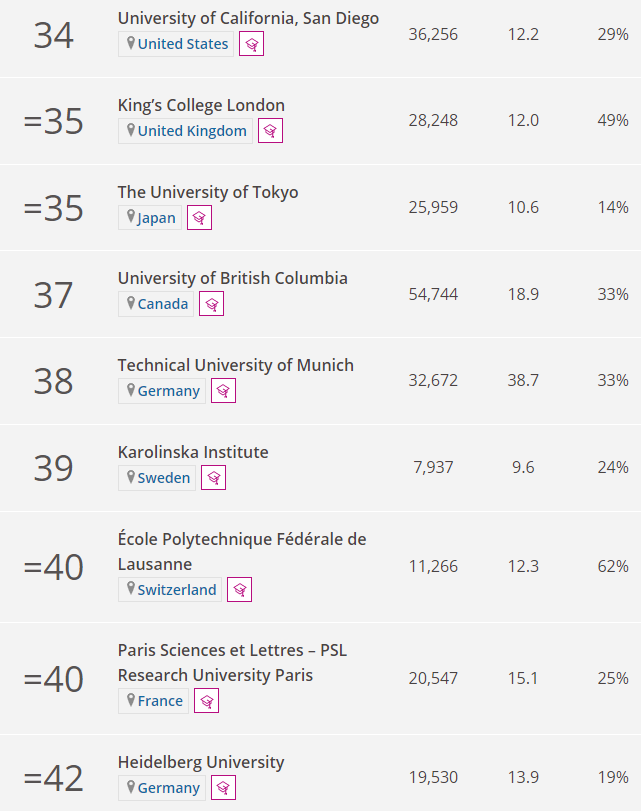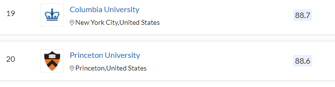 THE 세계 대학 순위를 보면 1위는 옥스포드, 2위 캘리포니아공과대학(미국), 하버드대(미국), 4위 스탠퍼드대, 5위 케임브리지대(영국),MIT(매사추세츠 공과대학), 7위 프린스턴 대, 8위 캘리포니아 대(버클리캠퍼스), 9위 예일대, 10위 시카고 대학 순입니다. 옥스포드와 케임브리지를 제외하면 모두 미국 대학입니다. 아시아 권 대학으로는 중국의 베이징 대학과 칭화대학이 함께 16위를 기록하며 가장 높은 순위입니다. 다음으로 싱가포르 국립대학(21위), 홍콩대학(30위), 일본 도쿄대학(35위) 순입니다. 유럽 스위스의 취리히 연방공과대학교(15위), 캐나다 토론토 대학(18위)도 순위가 높은 대학입니다.
