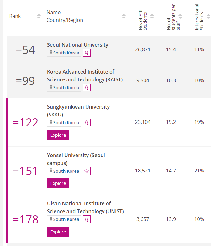 먼저 THE에서 발표한 한국 대학 순위를 살펴 보겠습니다. 대한민국 대학 순위로는 국립서울대가 1위를 차지했습니다. 명실상부 한국 최고의 대학으로 서울대는 부동의 1위를 지키고 있습니다. 서울대는 세계 순위로는 54위이며 아시아에서는 8번째 순위입니다. 다음 순위로는 2위 카이스트(세계 99위), 3위 성균관대(122위), 4위 연세대(151위), 5위 유니스트(178위), 6위 포스텍(185위), 7위 고려대(251-250), 8,9위 경희대, 세종대(251-300), 9위 한양대(351-400), 10위 지스트, 광주과학기술원(501-600)순입니다. 인서울 대학 종합대학으로 한정하여 보면 서울대, 성균관대, 연세대, 고려대, 경희대, 세종대, 한양대, 이화여대, 중앙대, 건국대, 서강대, 서울시립대, 국민대, 숭실대 순입니다. 일반적으로 알고 있는 대학 순위와는 다소 차이가 있는데 세종대학교의 순위가 높은 것이 특징입니다. 중상위권 대학으로 평가되는 한국외국어대는 THE평가에서는 순위권 밖에 있습니다. 지방 거점 국립대 순위로는 경북대, 부산대, 충남대, 전북대, 전남대, 충북대, 강원대, 제주대 순입니다.