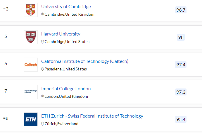 THE 세계 대학 순위를 보면 1위는 옥스포드, 2위 캘리포니아공과대학(미국), 하버드대(미국), 4위 스탠퍼드대, 5위 케임브리지대(영국),MIT(매사추세츠 공과대학), 7위 프린스턴 대, 8위 캘리포니아 대(버클리캠퍼스), 9위 예일대, 10위 시카고 대학 순입니다. 옥스포드와 케임브리지를 제외하면 모두 미국 대학입니다. 아시아 권 대학으로는 중국의 베이징 대학과 칭화대학이 함께 16위를 기록하며 가장 높은 순위입니다. 다음으로 싱가포르 국립대학(21위), 홍콩대학(30위), 일본 도쿄대학(35위) 순입니다. 유럽 스위스의 취리히 연방공과대학교(15위), 캐나다 토론토 대학(18위)도 순위가 높은 대학입니다.