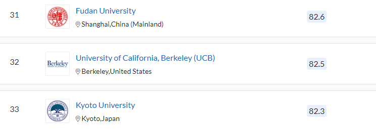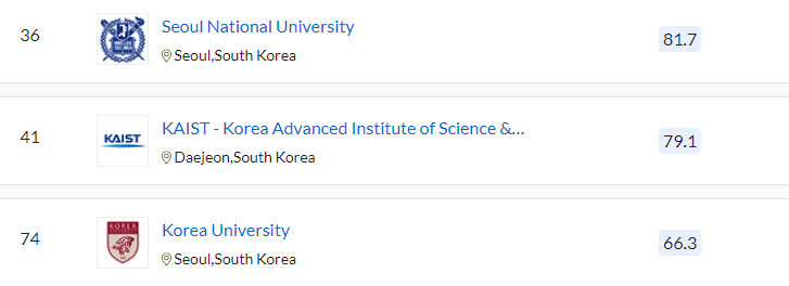 QS 세계 대학 순위에서는 미국의 MIT가 세계 1위입니다. 2위는 옥스퍼드, 3위 케임브리지대, 스탠퍼드대, 5위 하버드, 6위 캘리포니아 공과대, 7위 임페리얼 칼리지 런던, 8위 유니버시티 칼리지 런던, 취리히 연방 공과 대학, 10위, 시카고 대학입니다. QS 평가 아시아 대학 순위는 11위 싱가포르 국립대, 12위 싱가포르 난양공과대, 17위 중국 칭화대, 18위 중국 베이징대, 22위 홍콩대, 23위 도쿄대, 31이 중국 푸단대, 33위 교토대, 34위 홍콩과기대, 36위 서울대 순입니다.