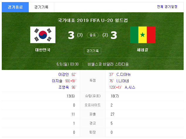 연장에 들어 와서는 한국이 먼저 골을 뽑아내고 연장 후반 종료 직전까지 잘 지켜 내면서 끝나는가 싶었는데 승리의 여신은 쉽게 다가오지 않았습니다. 세네갈이 한국이 후반 동점골을 넣은 것과 똑 같은 상황을 재현하며 경기는 3-3으로 끝나게 됩니다.