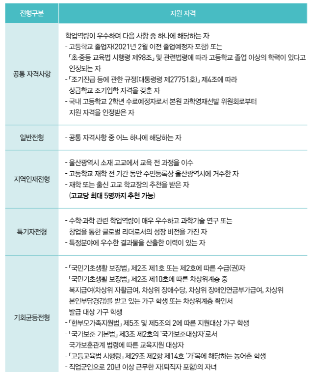 유니스트는 2018년부터는 수시모집으로만 신입생을 모집하고 있습니다. 2021학년도 기준으로 일반전형, 지역인재전형, 특기자 전형, 기회균등(정원외) 전형을 통하여 지원을 받고 있습니다. 2021년 모집 인원은 일반전형으로 320명, 특기자 15명, 지역인재 65명으로 정원내 400명으로 카이스트 695명을 이어 두번째로 많은 학생을 모집했습니다. 아직 2022년도 모집 인원은 일반전형 315명, 특기자 20명, 지역인재 65명으로 총원은 변동없습니다.