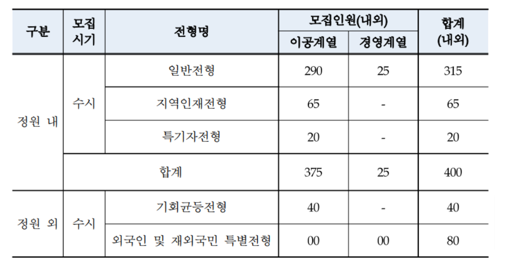 일반전형 기준으로 이공계열은 295명, 경영계열은 25명 모집이었습니다. 경영학부는 일반전형으로만 지원할 수 있습니다. 필요 제출서류는 자기소개서, 학교생활기록부, 교사추천서, 학교장추천공문(지역인재전형)이며 지역인재전형 서류 100%, 일반전형, 특기자, 기회균등 지원자는 1단계 서류 100%, 2단계 서류 50%, 면접 50%비중으로 선발합니다. 1단계 서류평가로는 4배수를 선발하며 면접은 제시문항을 통한 면접 방식입니다. 지역인재전형으로는 울산시 소재 고등학교 학생으로 학교장 추천을 받아야 하며 학교당 5명까지 지원 가능합니다.