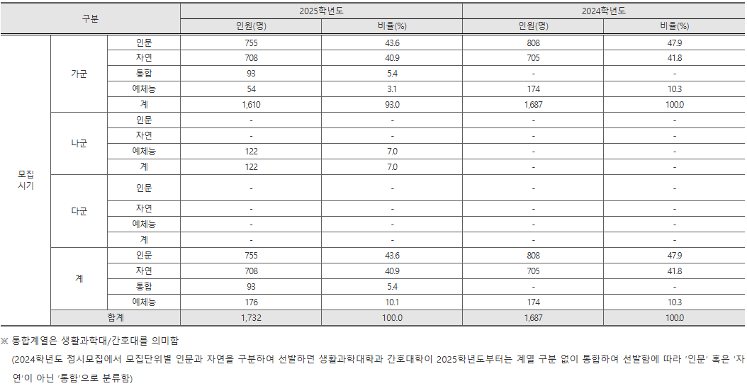 연세대는 가군, 나군(예체능)으로 1,732명을 모집합니다. 일반전형은 100% 수능성적을 반영하며, 의예과와 국제학과는 2단계에서 면접을 10% 반영합니다. 수능성적은 표준점수를 반영하며 영어는 등급별 점수를 부여합니다. 기존 운용하였던 인문/자연/예능/체능/국제/통합 모집계열을 네 가지로 유형화 하여 해당 유형별로 반영비율 및 탐구과목 가산점을 부여합니다. 원서접수 일정은 12월 31일부터 2025년 1월 2일 17시까지입니다.