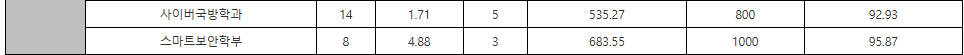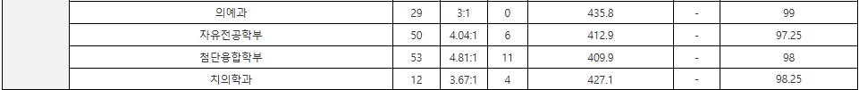 2024학년도 입시 결과입니다. 백분위 점수입니다. 경영대학 95, 국어국문 93.78, 사학 94.43, 불어불문 94, 생명과학 95.33, 식품공학 94.67, 정치외교 94.45, 경제 95.23, 통계 95.23, 물리 95.53, 신소재공학 95.62, 기계공학 95.33, 전기전자공학 95.8, 반도체공학 94.17, 의과대학 99, 교육 93.82, 수학교육 93.57, 간호대학 94.5, 자유전공 95.87, 사이버국방 92.93입니다.