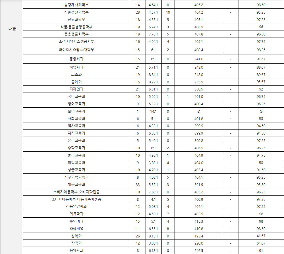 정시배치표 예상점수는 이투스 작성본입니다. 가능하면 다른 입시업체의 예상점수도 같이 보시면 도움이 될 것입니다. 국,수,탐 표준점수 기준입니다. 자유전공학부 412, 경제 411, 언론정보 404, 농경제사회 403, 사회복지, 인문계열 401, 윤리교육 400, 의예 416, 약학계열 409, 컴퓨터공학 408, 전기정보공학 405, 화학생물공학, 재료공학 403, 바이오시스템소재 398, 식물생산과학 397, 간호대학 394점으로 예상합니다. 지난해와 비교하면 합격 예상점수대가 상승했습니다.