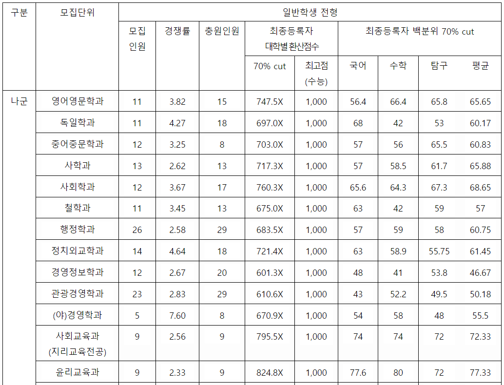 경상국립대 정시등급컷, 정시배치표 점수