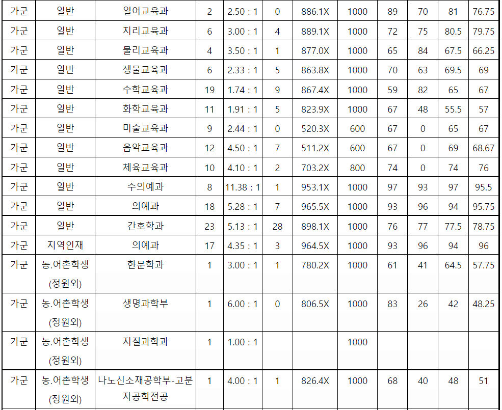 강원대 정시등급컷, 정시배치표 점수