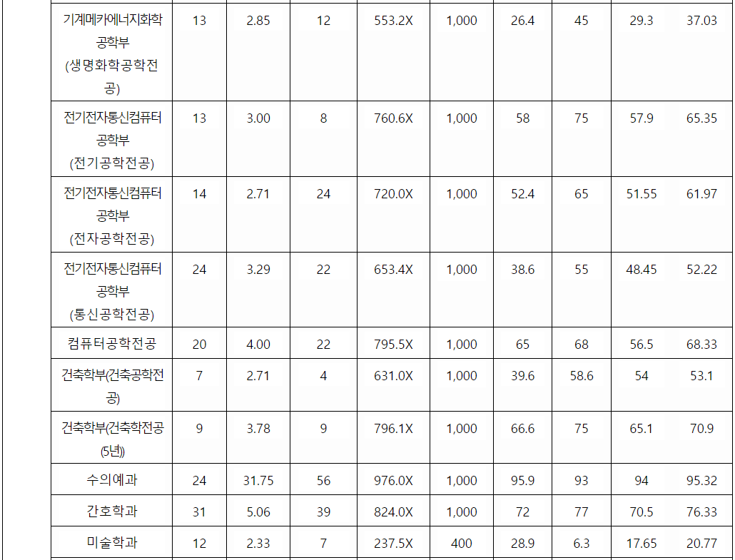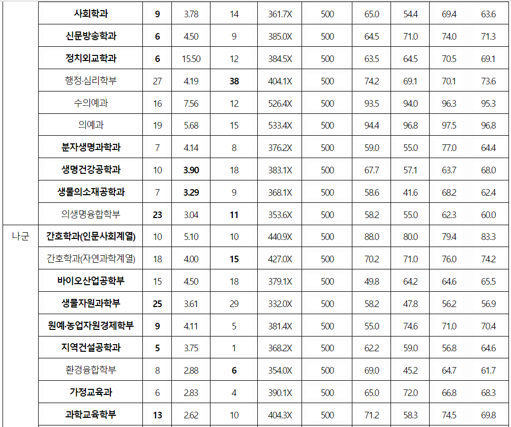 2022년도 종로학원 작성 정시배치표 참고입니다. 인문계 가군 경영회계 , 미디어커뮤니케이션 341, 경제정보통계, 행정심리, 관광경영 342, 정치외교, 영상문화, 부동산 343, 나군 간호(인문)353, 국어교육 348, 영어교육 347, 인문학부 338, 자연계 가군 수의예 398, 화공생물공학 352, 분자생명과학과 348, 에너지자원산업공학, 건축학 347, 생명건강공학과 346, 생물의소재공학, 건축토목환경공학 345, 동물응용과학과 344, 나군 수학교육과 367, 과학교육학부 361, 간호 371, AI융합학과 357, 컴퓨터공학과 355, 전기전자공학과 354로 예상합니다.