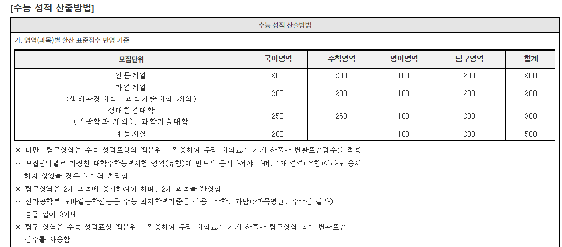 경북대학교 2026학년도 정시모집은 전체 1,044명을 선발하며, 가군 507명, 나군 506명, 지역인재 31명으로 구성되어 있습니다. 전형 요소는 수능 100%가 기본이며, 예체능계는 모집단위에 따라 수능과 실기를 합산하여 총 1,000점으로 평가합니다. 학종 요소나 비교과는 반영하지 않으며, 의예과 면접은 합·불판정으로만 활용합니다. 수능 영역 반영 비율은 계열별로 크게 구분됩니다. 인문계열은 국어 300, 수학 200, 영어 100, 탐구 200, 자연계열은 국어 200, 수학 300, 영어 100, 탐구 200을 반영하며, 모두 800점 체제를 1,000점으로 환산합니다. 자율전공학부는 국어·수학을 각각 250점(×1.25)으로 반영하며, 생태환경대·과학기술대·자율미래인재학부 자연계열은 국어를 제외하고 수학 400(×2), 영어 200(×2), 탐구 200으로 구성됩니다. 수학은 표준점수를 기반으로 계열별 상이한 가중치를 적용하며, 탐구는 대학 자체 변환표준점수를 적용합니다. 자연계열은 올해부터 새로 도입된 과탐 1과목당 5% 가산점을 받을 수 있습니다. 영어는 절대평가 등급별로 1등급 100점, 2등급 97점 등 차등 반영하며, 한국사는 1~4등급은 10점, 이후 등급별로 미세 감점이 적용되는 가산점 체제를 유지합니다. 수능 점수 산출 방식은 국어·수학·탐구의 표준점수를 가중한 뒤 총점을 1,000점 체제로 환산하는 방식이며, 탐구는 2과목 모두 반영합니다. 수능 응시영역은 대부분 학과가 전 영역을 요구하지만, 전자공학부 모바일공학전공은 미적/기하 필수 + 과탐 2과목 필수라는 별도 조건이 적용됩니다.